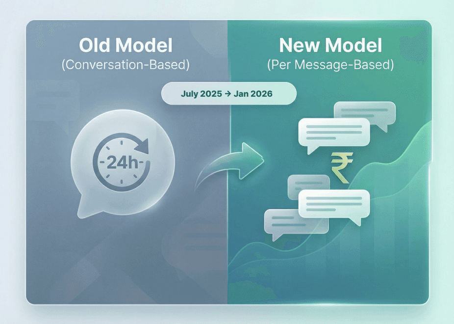 The current system charges per template message delivered. When you send a marketing broadcast, an order confirmation, or an OTP, each delivered message counts separately. This makes costs more predictable in some ways but requires closer attention to message volume.